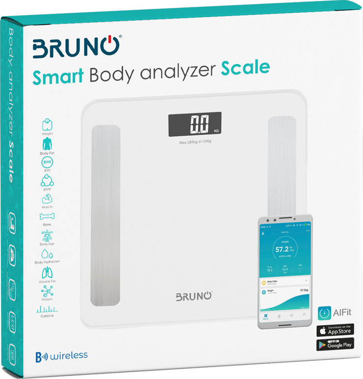 Smart ψηφιακή ζυγαριά της Bruno με επιφάνεια κατασκευασμένη από tempered glass και μεγάλη ευανάγνωστη οθόνη LCD. Μπορεί να υπολογίσει με εξαιρετική ακρίβεια το σωματικό βάρος, το λίπος, το νερό, την μυϊκή μάζα, την οστική μάζα, τις θερμίδες, την μεταβολική ηλικία, BMR και ΒΜΙ κ.α. Διαθέτει 3 μονάδες μέτρησης (kg, lb, st) με δυνατότητα μέτρησης έως 180kg και ευαισθησία 0.1kg για ακριβής μέτρηση του σωματικού βάρους. Η σύνδεση της ζυγαριάς με το smartphone γίνεται μέσω Bluetooth και την χρήση της εφαρμογής AIFit.
